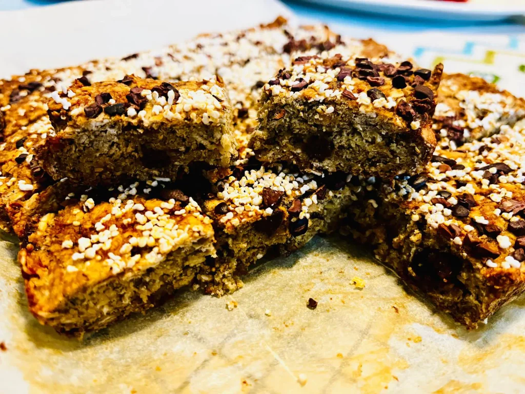5. Spread the dough in the prepared pan, smoothing the top. Sprinkle the top with the chocolate chips and amaranth pops/ hemp seeds (pressed them down so that they don’t fall off)